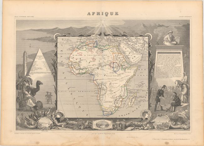 C. Afrique (17.1 x 11.0"). This map of the continent shows the colonial possessions and major tribal kingdoms. The interior is mostly void of detail, with the exception of the mythical Monts de la Lune, or Mountains of the Moon in the center of the continent. These legendary mountains were long thought to be the source for the Nile, dating back to Ptolemy. Stanley traced a fluvial connection from the Nile back to a mysterious snowy mountain range in Central Africa in 1888, dubbing the mountains Ruwenzori and proclaiming them the Nile source that Ptolemy described. The map is surrounded by steel-engraved scenes of the pyramids, wild animals, natives, the French army in Algeria, and vignettes of Alexandria, Cairo, and Algiers. The map also includes population statistics from the major countries and French text describing the continent and the engravings surrounding the map. Reference: Norwich #140.