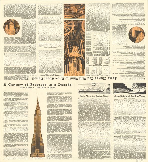 Designed by "ye olde cartographer" William Ogg Fitzgerald as a promotional map for the Chrysler Corporation, this handsome pictorial map centers on the Motor City. Its decorative style is a throwback to classic maps, but its emphasis is on the modern automobile industry. The Chrysler Engineering Building and the plants and headquarters for Dodge, Plymouth, and De Soto brands are prominently shown; the General Motors Building and Chevrolet Plant look paltry by comparison. An illustration demonstrates "ye airflow principle," showing the aerodynamic efficiency of one of the company's cars. The map includes several notes on the history of the area and extends to show nearby towns and cities and a small portion of Ontario. Roads are shown, with thick red lines indicating the routes to various Chrysler Motor Plants. At top right is a decorative title cartouche that shows an early French settler and local Indigenous peoples along with the logos of Chrysler, Plymouth, and De Soto, made to look like historical coats of arms.