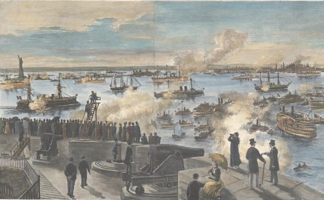 The view is taken by Castle William on Governor’s Island, with the Statue of Liberty visible at left and lower Manhattan at right. Spectators line the castle wall while numerous steamships and small boats crowd the bay to witness the array of military ships making their way up to the Hudson River.