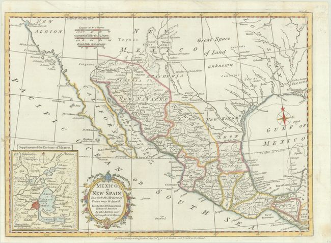 This is a very attractive map of the American Southwest and Mexico. California is labeled New Albion with no detail outside of a few coastal place names. The region of present-day Arizona and New Mexico is well delineated with numerous Indian villages and the locations of missions. The area from New Mexico to Louisiana is named as "Great Space of Land Unknown." The small Texas settlement of Cenis is near the New Kingdm. of Leon. An inset shows Mexico City on the large Lake of Mexico. Finely engraved with a decorative title cartouche and compass rose. This map was originally published in 1777, this being the 1795 edition by W. Strahan and T. Cadell.