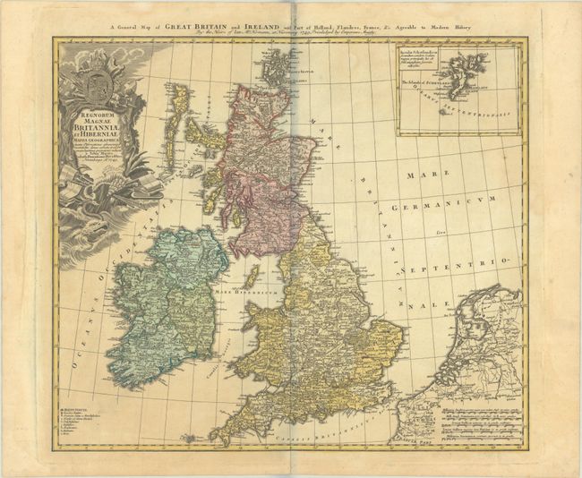 This handsome map of the British Isles includes very good detail of Ireland, England, Scotland, Wales, and the island groups of Orkney and the Outer Hebrides. The map extends to include the adjacent parts of Holland and Belgium with five distance scales below. At upper right the inset chart details the Shetland Islands. A key at lower left includes symbols for cities, towns, villages, universities, forts and redoubts. The large, ornate title cartouche is decorated with a sea monster, shells, a coat of arms and the accoutrements of battle. Titled in English along the top of the map: "A General Map of Great Britain and Ireland with part of Holland Flandres, France, &c."