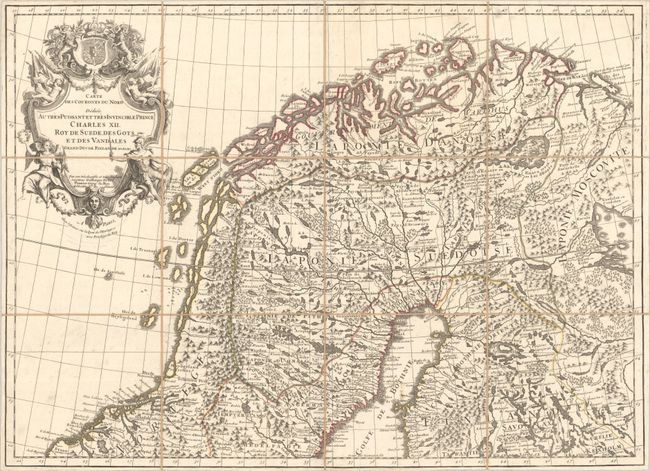 Magnificent map of northern Scandinavia with a brilliant figurative armorial cartouche dedicating the map to Charles XII, King of Sweden. The map is filled with excellent detail of the topography and the cities, towns and villages. There is evidence that the imprint of Louis Renard was been removed under Delisle's imprint, evidence of the failed relationship, in which Renard sold Delisle's maps in the Dutch market. This is the northern portion of a two-sheet map, set within its own borders. Dissected and backed in linen.