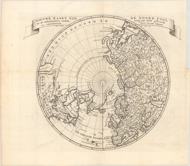 First state of this attractive copper engraved map on a north polar projection. The northern part of the island of California is shown and the Pacific region is completely blank. There is good detail in Europe and Asia, with even the Great Wall of China shown, while relatively little detail appears in North America. The Mississippi River extends west and connects with a large lake, Gnacsitares that almost reaches the West Coast, based on the embellished account of Baron de Lahontan. Quivira and Sante Fe are also noted in the west. Greenland is connected to both the North Pole and Canada. Ribbon style title cartouche. Engraved by J. Keyser.