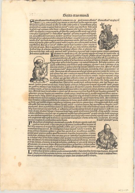 This early view is a reduced version of Schedel's larger view of Constantinople. It shows the city with the same windmills, monuments and mosques within an imaginary countryside. The text describes the siege of Constantinople in 1453. The view is on a full sheet of Latin text measuring 13.1 x 18.7". On verso are portraits of Suncassianus, the king of Persia and Armenia, John Capistrano, and Francesco Filelfo of Ancona.