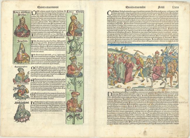 This double-page woodcut illustration of the city of Jerusalem is one of the more detailed views in the Nuremberg Chronicle. It is an imaginary view of the destruction of Jerusalem, with towers toppled and the Temple of Solomon engulfed in flames. It is actually a synopsis of six separate holocausts described in the text. Major points in the city are identified with text notations. Of special interest, in the upper left of the image, are the figures of Jesus and Satan shown on top of Mount of Satan. On a full sheet of Latin text measuring 23.6 x 17.3". On verso are woodcut illustrations of the capture of Zedekiah, part of the lineage of Christ, and portraits of priests and profits.