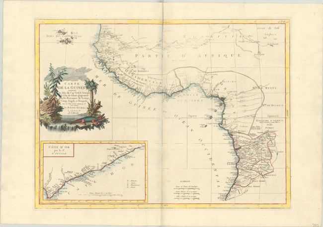 This elegant map of western Africa is based on a map by Bonne. It provides a detailed view of the coastal regions from Cote d'Ivoire to Angola. Political divisions, towns and cities, rivers, mountains, deserts, and more are identified. The interior of the continent is still largely unexplored. Cape Verde appears off the coast. An inset at bottom left focuses on the Gold Coast, with a key to identify the region's colonizers. The decorative title cartouche features a predatory cat and a crocodile.