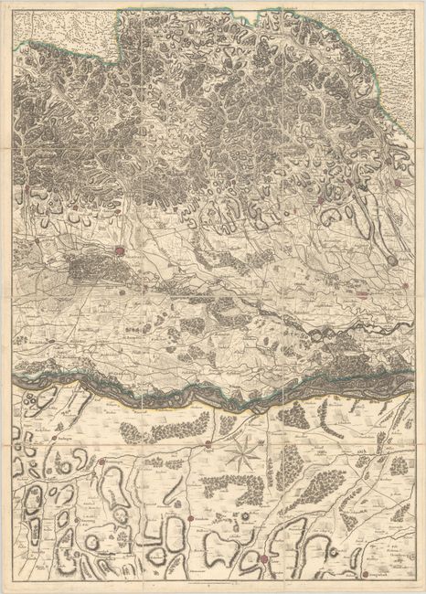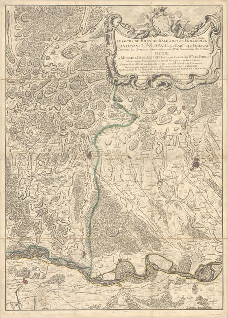This intricately detailed map on 5 sheets follows the Rhine River from Basel, Switzerland to Landau, Germany. Loops, oxbows, branches and islands along the river are depicted, many of which were removed in later centuries to improve the navigability of the river. The surrounding region is also shown in detail, including cities (depicted as miniature bird's-eye plans), villages, individual houses, roads, pathways, forests, fields, and topography. The maps are all oriented with north to the right, and the rococo title cartouche is on the northernmost sheet. Each sheet is dissected and mounted on contemporary linen with a printed bookseller's label (a Tournay Chez Deflinne Libraire) on verso. The maps fold into a marbled slipcase (7.2 x 7.5") with the bookseller's label. Size is for each sheet; if joined together, the map would measure approximately 101 x 28.3".