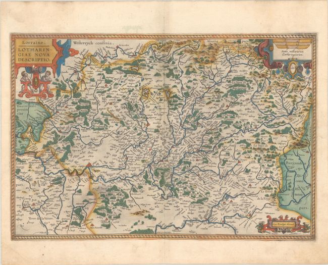 Beautiful map compiled by Ortelius from two maps by Mercator. It is a compilation from "Lotharingiae Ducatus Pars Septentrionalis" and "Lotharingiae Ducatus Pars Medionalis" published in Mercator's atlas Galliae tabulae Geograhicae, 1585. This lovely copper engraved chart includes Metz and Nancy an is filled with hundreds of villages and place names. Adorned with three elaborate cartouches. Latin text on verso, published in 1595.