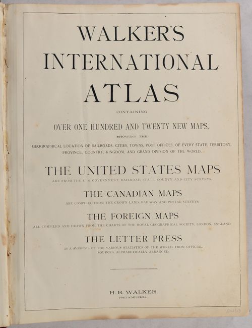 This large atlas contains 65 single-page and 87 double-page maps of the world. Many of the maps are hand colored, some are printed color, and others contain both methods reflecting a transitional time period when printers used plates made by different processes. Also unusual for this late date is the fact that the maps are tipped in, indicating a higher quality publication. Approximately half of the atlas is focused on the United States and feature nice maps of the west including Texas, Indian Territory, Colorado, Montana, Wyoming, and more. Each map is preceded by an introductory page including a list of railroads, counties, and an index to towns and cities. The atlas also features numerous city plans including locations not typically seen such as Atlanta, Brooklyn, Columbus, Detroit, Denver, Pittsburgh, Buffalo, Richmond, Dallas, and more. Following the maps are "Curiosities of Statistics or Valuable Facts for the People" and a Patron's Directory. 440 total pages, A.E.G. Rebacked in red cloth over original red leather boards with gilt title on the front cover.