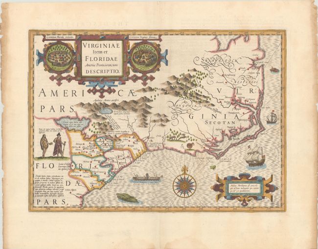 This stunning map was compiled from two of the most important source maps of the early colonial period: John White's Virginia and Jacques le Moyne's Florida. Hondius' map became the prototype map of the region for the first half of the 17th century and continued to influence the cartography of the region until the middle of the 18th century. Largely due to the enormous success of Hondius' Atlas, Le Moyne's erroneous depiction of a large inland lake (Lacus aquae dulcis) from which the R. de May (St. John's River) flows in a southeasterly direction was popularized. Chesapeake Bay, here called Chesepioock Sinus, and the area south towards C.S. Romano Hispanis are shown in their White delineations. The Indian villages of Paquiwok, Croatoan, and Wococon are named in the Outer Banks and several others along the Albemarle and Pamlico Sounds. The map is extensively decorated with depictions of Indian villages incorporated in the title cartouche, a Floridian king and queen and Virginian natives in a canoe taken from De Bry, wildlife including a wild turkey, ships, sea monsters and a superb compass rose. English text on verso, published in the only English edition.