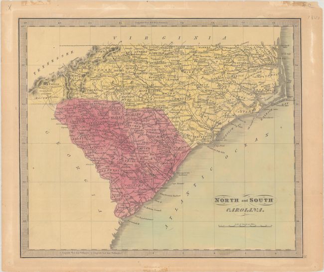 This handsome and detailed map of the Carolinas delineates roads, towns, villages, settlements, ports, watershed, and more. County configuration in North Carolina predates 1835, with no sign of Davie County. Early railroads span from Charleston to Augusta; Clinton to Wilmington; and Raleigh to New Bern. The map is surrounded by a keyboard-style border and with fancy titling. Jeremiah Greenleaf took over the production of David Burr's New Universal Atlas when Burr was appointed Geographer of the House of Representatives in 1838.