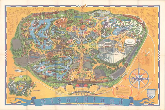 This map is part of the "blue border" Disney maps, which were issued from 1966-76. This group differs from the previous series (1958-64) in that it shows Tomorrowland and the attractions Disney had created for New York's World Fair (1964-65). These maps also differ from the previous series as they lack any characters in the surrounding border. There is good detail of all the attractions, restaurants and shops with banners identifying the various parts of the park including Main Street, Adventureland, Frontierland, Fantasyland, and Tomorrowland. In this edition (updated from the 1966 map), the Monsanto Hall of Chemistry has been replaced with "Adventure Thru Innerspace" and the Monsanto House of the Future no longer exists. Title is enclosed in a large compass rose at lower right. No artist is noted, though the map is based upon earlier works by Sam McKim.