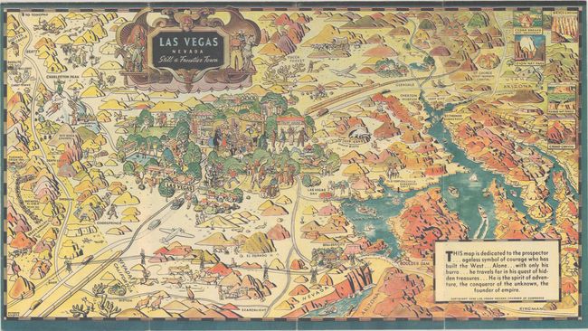 A small pictorial map by Raymond P. Winters covering Las Vegas, Boulder Dam, Lake Mead, and beyond. Filled with illustrations intended to represent the region including a rodeo scene, horse racing, gambling, wedding, prospecting, and more. Published by the Las Vegas Chamber of Commerce with related text on verso. Self-folding into pictorial wrappers featuring a prospector.