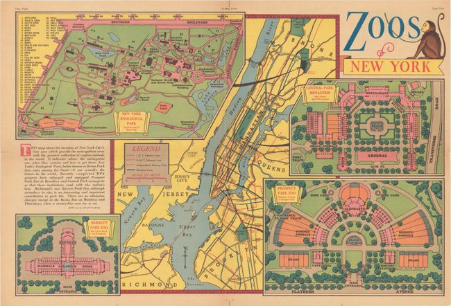 C. Zoos of New York, circa 1940 (21.9 x 14.5"). Plans of four New York zoos - New York Zoological Park, Central Park Menagerie, Barrett Park Zoo, and Prospect Park Zoo - surround a transportation map of the city. The title cartouche is accompanied by an illustration of a monkey.