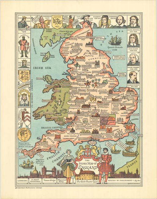 This charming pictorial map gives an overview of the history of England and Wales. Major cities are located, some of which include images of important buildings and structures, such as Stonehenge and Windsor Castle. Famous London buildings are shown at bottom, alongside the title cartouche, a maiden and a Yeoman Warder. The partial border incorporates portraits of important people in British history, including Aflred the Great, Elizabeth I, Shakespeare, and Charles Dickens. Created by Egbert G. Jacobsen and published in Chicago by Colortext Publications, which created a series of Story Maps between 1935-50.