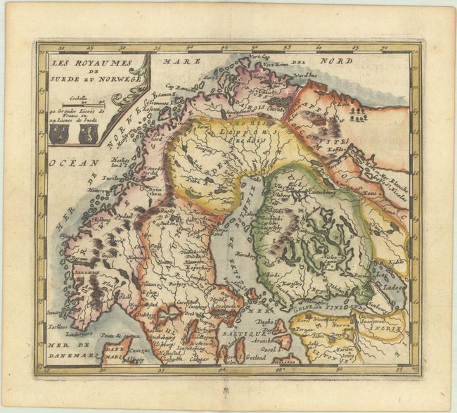Finely engraved little map of Scandinavia and the Baltic decorated with a title cartouche incorporating two tiny armorial shields.