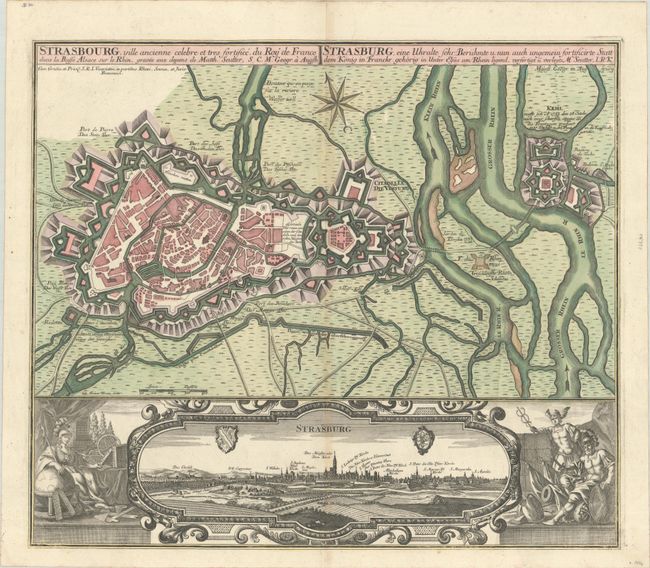 Superb bird's-eye plan of the fortifications for Strasbourg and the surrounding countryside. Below the map is a panoramic view of the great city with numerous buildings marked. The view is set in an elaborate border flanked by opposing allegorical vignettes of Bellona (Peace) on the left and Mercury and Ares, god of War, on the right.