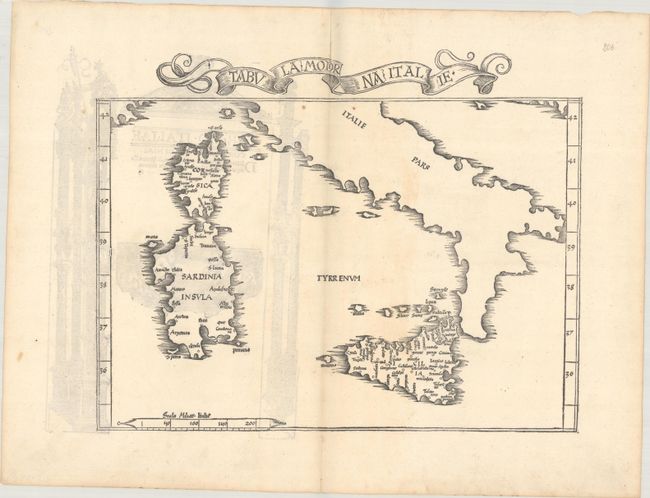 This crisply engraved Ptolemaic map focuses on Corsica, Sardinia and Sicily. Ancient place names are located primarily along the coasts, and a flaming Mt. Etna is depicted in Sicily. The woodcut maps from the blocks of Laurent Fries were based on the work of Waldseemuller. Elaborate woodcut engraving on verso.