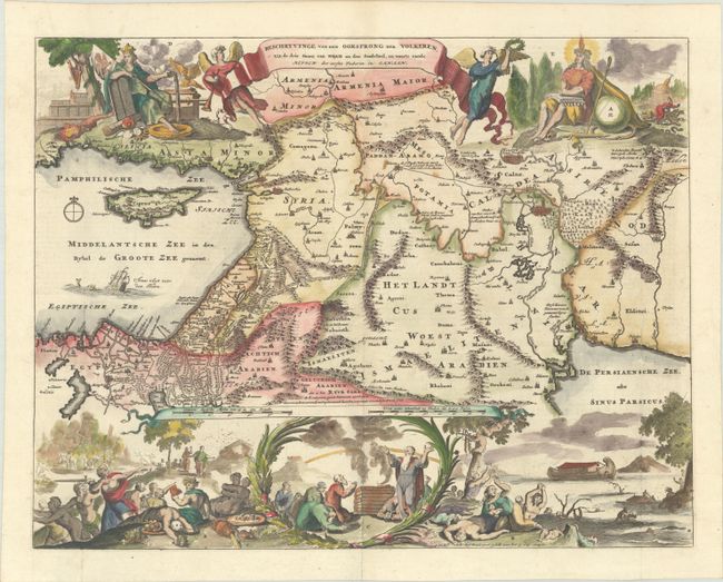 This Dutch Bible map covers the region between the Mediterranean and the Persian Gulf, depicting numerous Biblical sites, including the wanderings of the Children of Israel, Jonas & the whale, Abraham's route from Ur, and the Garden of Eden. Other major places graphically illustrated in the map include Nineveh, Babylon, and the mountain where the Ark came to rest. Two angels hold aloft the title banner and pictorial scenes in the top corners representing the Old and New Testaments. Across the bottom of the map are several Biblical scenes illustrating the story of Noah and the Ark. Although the map was copied from Bastiaan Stoopendaal's map of 1682, all of the decorative scenes are unique to Avelen. Dutch text on verso.