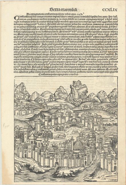 This early view is a reduced version of Schedel's larger view of Constantinople. It shows the city with the same windmills, monuments and mosques within an imaginary countryside. The text describes the siege of Constantinople in 1453. The view is on a full sheet of Latin text measuring 10.9 x 16.0". On verso are portraits of Suncassianus, the king of Persia and Armenia, John Capistrano, and Francesco Filelfo of Ancona.