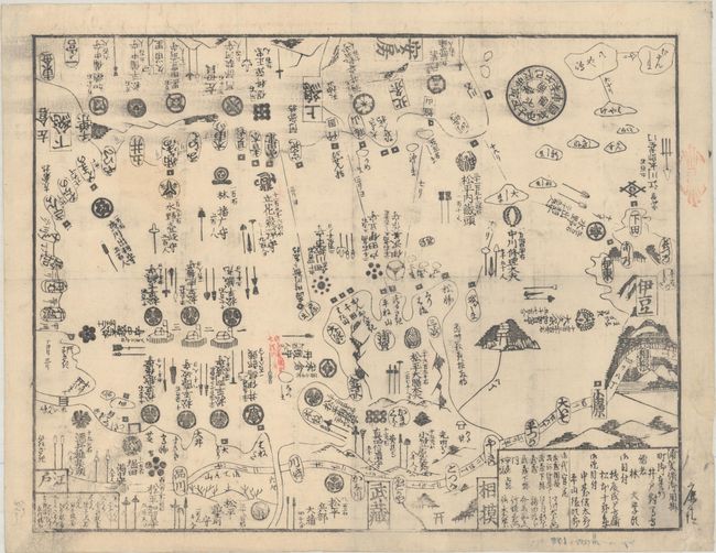 This Japanese broadside, or kawaraban, shows Tokyo (Edo) Bay and its various defenses through a dense and complicated series of symbols and notations. It was created around the time of the Perry Expedition, which consisted of two American military and diplomatic missions (1852-55) to visit the Tokugawa shogunate. This government had a strict isolationist policy and few foreign visitors gained entry over its 250-year existence (1603-1868). While Perry’s first visit was limited in success, his second journey assured the diplomatic and trade ties that the U.S. sought. Japan’s opening of its doors eventually led to the fall of the Tokugawa shogunate and the restoration of Emperor Meiji.