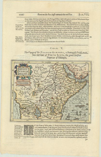 Charming little map with a fair amount of detail on the eastern coast, reflecting colonial trading interests. Below the equator there are the two large lakes where the Nile originates, Zaire / Zembre and Zaftan. The map is decorated with a strapwork title and scale cartouche. The map originally appeared in the Mercator/Hondius Atlas Minor and was used here by Purchas with the additional title above the map, "The Voyage of Sir Francis Alvarez, a Portugall Priest, made unto the Court of Prete Ianni, the great Christian Emperour of Ethiopia," referring to the mythical kingdom of Prester John. On a sheet of English text measuring 8.6 x 13.4".