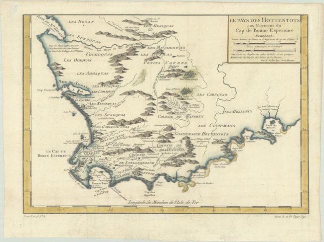 A. Le Pays des Hottentots aux Environs du Cap de Bonne Esperance, by Jacques Nicolas Bellin, from La Harpe's Histoire Generale des Voyages..., circa 1781 (13.7 x 9.6"). A beautifully engraved copper-plate map of the Cape of Good Hope from Saint Helena Bay to Mossel Bay. Dutch settlements are mostly confined along the coast and southern regions. The inland regions are depicted as deserts, savannas, forests, and mountain ranges, with tribal names and a few Boer colonies located. Condition: Issued folding now flat on watermarked paper dated 1781. There is some minor foxing at bottom.