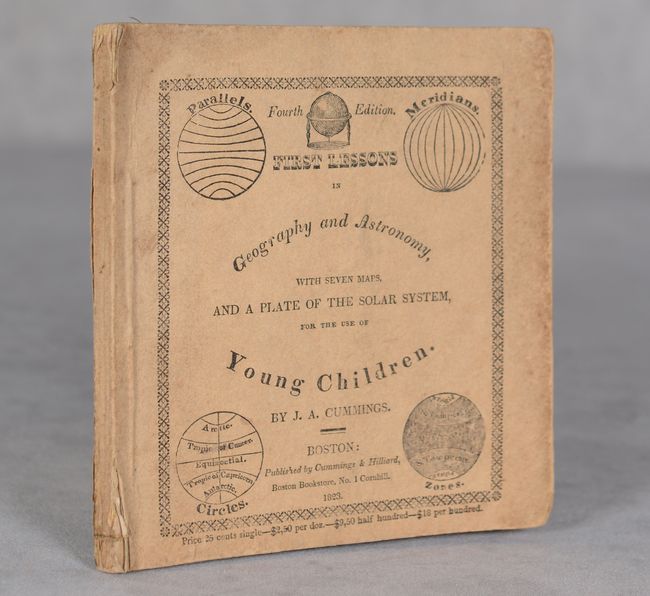 This scarce, petite geography book was intended for young children who had just mastered reading and writing. The author states that the subject of geography was previously thought to be "above the capacities of young children, and fit only for the study of higher classes. But it is fully ascertained, that with the use of maps, it is one of the most suitable exercises for children of any age." The book includes a total of 8 single-page plates including maps of the world in two hemispheres, North America, South America, Europe, Asia and Africa. Also includes a solar system plate at the back of the 82-page volume. 4th edition. Gray stiff paper wrappers and signed on the front free endpaper by "John M. Williams 1823." These Cummings "First Lessons" geographies are uncommon on the market, with only one past sales record for this 1823 edition and 5 sales across all publication years.