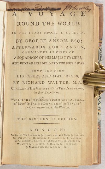 This is the sixteenth edition of Anson's famous work describing his voyage around the world. In 1740, George Anson set sail in command of a squadron sent to attack Spanish possessions and interests in South America. The expedition was ill-equipped and failed to carry out its original ambitious mission. By June 1741 when Anson reached Juan Fernandes, his force had been reduced to only three of the original six ships, while the strength of his crews had fallen from 961 to 335. After launching several attacks on the west coast of South America and recuperating on the island he collected the remaining survivors on his flagship, the Centurion, and set sail in search of one of the richly laden galleons that conducted the trade between Mexico and the Philippines. The indomitable perseverance he had shown during one of the most arduous voyages in the history of sea adventure gained the reward of the capture of an immensely rich prize, the Nuestra Señora de Covadonga, which he encountered off Cape Espiritu Santo on June 20, 1743. From here he sailed back to Canton before traveling through Southeast Asia and around the southern tip of Africa. He made his way back to England, arriving in Spithead in June 1744.