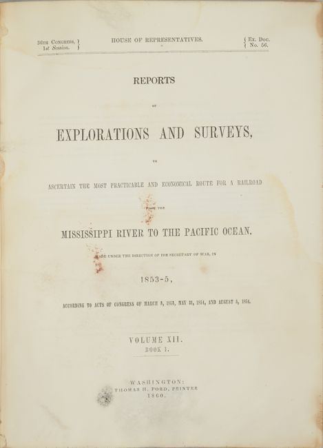 This is the 1860 House edition, which is a revised and enlarged version of Stevens' narrative first published in octavo format in 1855. This volume describes Stevens' explorations from St. Paul to Puget Sound and contains his general narrative and final report and a superb collection of lithographs by John Mix Stanley, the expedition artist. Among the important lithographs are those that depict St. Paul, Fort Union, Fort Benton, Blackfeet Indians, Fort Owen, Nez Perces, Mount Rainier, and Cantonment Stevens (Corvallis). Included are lithographs of Hellgate (Missoula before there was a settlement), of the Big Hole Valley in Montana, and of the Great Falls of the Missouri. Volume XII is one of the most richly illustrated volumes in the entire series containing a total of seventy tinted lithographs (one of which is folding). The volume is missing the 2 issued folding maps.