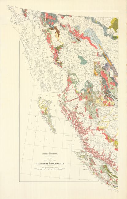This highly detailed and visually pleasing geological map was published under the direction of the Canadian Department of Mines and Resources. It covers all of British Columbia (and a sliver of Alaska) with a color-coded legend at right identifying 49 geological types of sedimentary, volcanic, and intrusive rocks along with their relative ages. In addition to the geology, the map presents good baseline data including rivers, mountain peaks, offshore islands, roads, railroads, and more. Published as part of the Geological Survey of Canada, which up to this point in time had only mapped a quarter of the country's geology.
