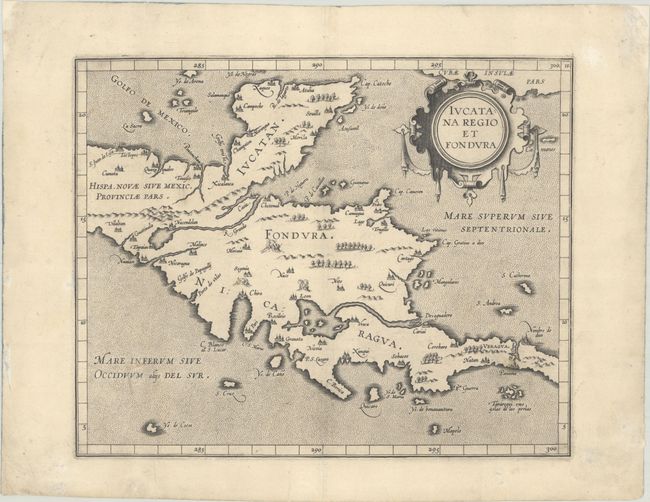 This fascinating map is from the first printed atlas relating exclusively to America. Wytfliet's work was referred to as a continuation of Ptolemy, despite the fact that there was little connection with Ptolemy except for his name on the title page. Wytfliet compiled his atlas using multiple published sources, including Ramusio, Hakluyt, and De Bry. This map covers the Yucatan peninsula and Central America. Several over-sized rivers and lakes are prominently shown. A spurious R. Grande flows from a large lake in present-day Guatemala. Lake Nicaragua and the San Juan River are the dominant features in Central America. Another wide river nearly bisects the isthmus near Panama City. The map is adorned with a decorative strapwork title cartouche.