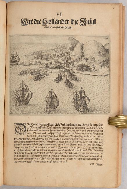 Part VIII features Contrafactur des Scharmutz els der Hollender wider die Portigesen in dem Flus Balusabar… (10.1 x 12.8"), the first published map of the strategically important Strait of Singapore, which had been jealously guarded by the Portuguese for nearly a century. This rare map is oriented with north to the left and depicts the southern coast of Sinca Pora (the Singapore island) and Rio Batasubar (the Straits of Johor). Most of the coastline is marked as Cust onbekent (coast unknown). The map records a naval battle between the Dutch and Portuguese in which the Dutch captured a Portuguese galleon in 1603.