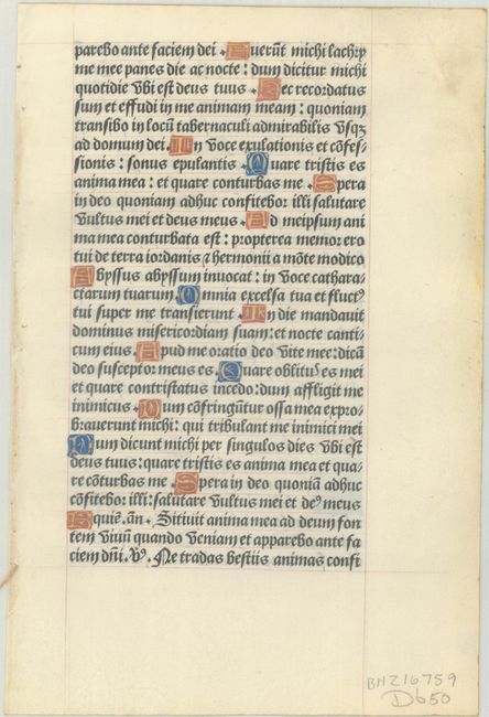 This vellum leaf has two large initials and numerous small initials that were hand painted in red, blue and gold. The text includes part of Job Chapter 17, and beginning with the large "S" on verso translates as: