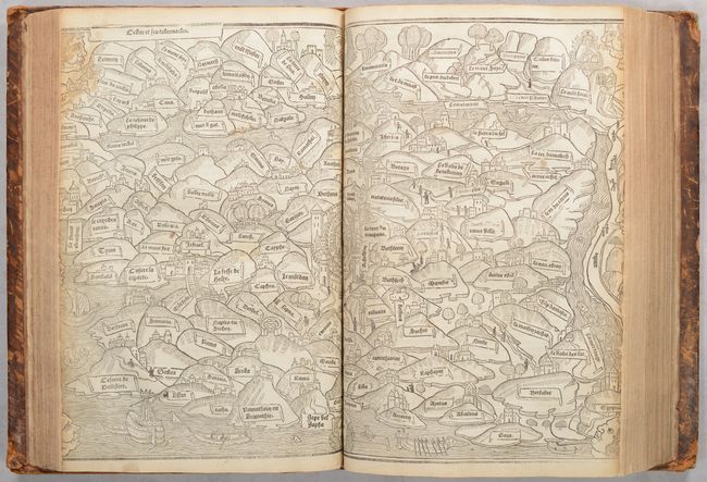 This is a complete edition of the rare and popular Mer des Histoires, a French translation of the world history, Rudimentum Novitiorum. First published in 1475, the Rudimentum Novitiorum was the first publication to include printed maps depicting land forms and countries (one of the world and one of Palestine). The French edition served to popularize the work, and first appeared as Mer des Hystoires in 1488 with new woodblocks, on a slightly smaller scale and with the titles translated into French. A third set of woodblocks were cut in 1491, again slightly reduced in size, and with a few minor changes. In his book, The Earliest Printed Maps, Tony Campbell remarks that the maker of the maps for the 1491 edition was a "thinking individual," because he corrects errors made in the 1475 and 1488 blocks. The 1491 blocks were reused in several editions through circa 1555. This 1543 edition (erroneously marked as 1536 on the title page in manuscript ink) was published by Nicolas Cousteau for Charles L'Angelier, and includes woodblocks from the 1491 edition.