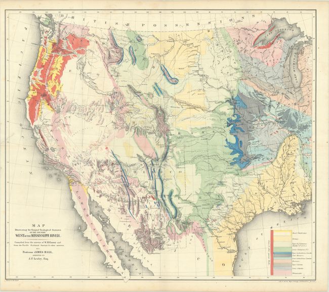 This great map of the western United States was one of the first geological maps of the region. It illustrates the many mineral resources that helped spur westward migration and expansion. The legend uses color to identify eleven geological types. The map is also filled with terrific detail of mountains, watersheds, cities, and roads. It covers the country from the Ohio River Valley to the Pacific and extends to include the states of Sonora and Chihuahua in Mexico. The political divisions include the large western territories of Washington, Oregon, Utah, New Mexico, Nebraska, and Kansas. Drawn by Thomas Jekyll. Lithographed by Sarony, Major & Knapp, 449 Broadway, New York.