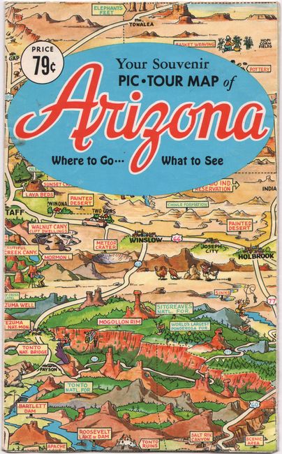 This colorful pictorial map promoting the state was drawn by artist Don Bloodgood and published by Petley Studios in Phoenix. It is filled with cartoonish characters and playful illustrations highlighting the state's attractions including natural wonders, points of interest, historical sites, Indian reservations, and much more. A few highlights include the Grand Canyon, Mogollon Rim, Monument Valley, Organ Pipe Cactus National Monument, and Tombstone. A note below the title declares "Arizona combines the romance of the old west and the promise of the space age." The verso contains related text and illustrations and an unused mailing address panel. Price 79c. Copyrighted by H.S. Crocker in San Francisco. Self-folding into pictorial wrappers (5.5 x 9.0").