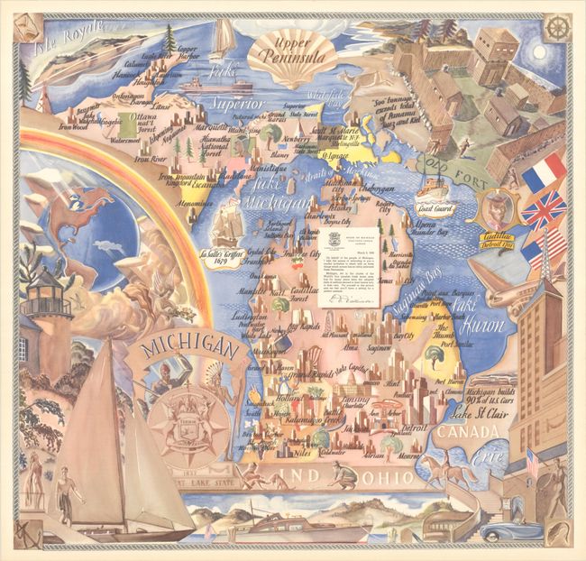Issued by the Michigan Department of Public Instruction, this gorgeous pictorial map depicts Michigan's history, culture, and architecture in an elegant, modern style. The left side of the map is dominated by an ornate vignette that incorporates a globe showing the Western Hemisphere with an illuminated Michigan, the state seal, a large sailboat, a hunter and Indigenous man, and more, all under the arc of a rainbow. At right is an Art Deco building and a swooping airplane. The old Fort Detroit is depicted at top right, with a portrait of Cadillac, the founder of Detroit, just below. Towns and cities are accompanied by representative illustrations. Various vessels fill the lakes, including La Salle's ship Le Griffon in Lake Michigan. A note from Governor Luren D. Dickinson makes the case for the "Friendly State" as a vacation destination: "Michigan, set in the cluster of the World's four greatest fresh water seas, has for many years been the adopted state of millions second in their hearts only to their own. Put yourself in this picture and we feel you'll have a setting for a perfect summer." The verso features text covering the state's flag, tourist attractions, capitol, education, agriculture, and more.