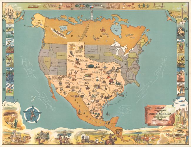 This humorous map of North America was drawn with a vastly oversized Texas occupying approximately half of the United States. The eastern part of the United States is playfully identified as "Unannexed Territory" and the western portion is "Ceded Territory." Texas is filled with illustrations and amusing text including "1 Texas inch Equals 2 Feet", "True location of North Pole - 36.04 mi due North of Amarillo", and "Beefiest Turkeys" to name a few. Surrounding the map image are a series of related vignettes including the Alamo, San Jacinto Monument, and "Rowdy Rodeos." Drawn and illustrated by Mark Storm and published by John Randolph. The map is accompanied by its original mailing envelope and two sheets of "One Hundred Texas Bucks" (13.6 x 5.6"), dated 1952, bills of Lone Star State-themed pretend currency featuring the Alamo, a portrait of Stephen F. Austin, and "The Eyes of Texas."