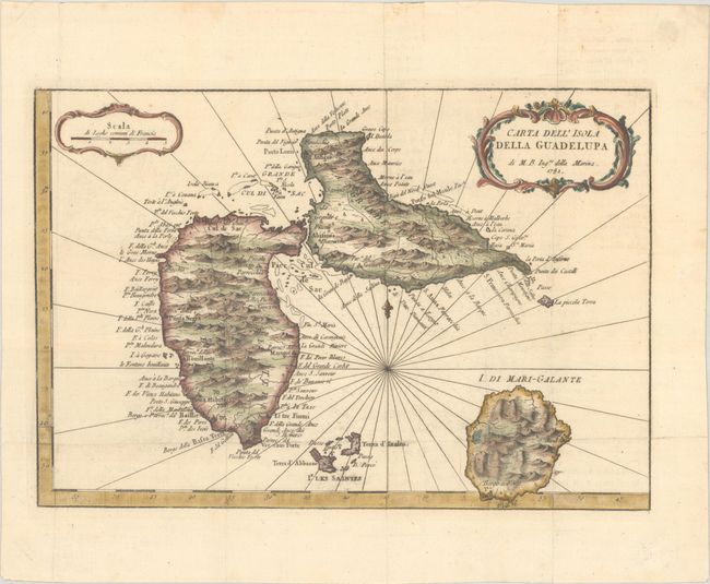 A. Carta dell' Isola della Guadelupa, by Jacques Nicolas Bellin, from Teatro della Guerra Marittima e Terrestre, dated 1781 (11.8 x 8.1"). This handsome map of the island group is adorned with rhumblines, fleur-de-lys, and two decorative rococo-style cartouches. It is filled with good detail and place names throughout. It names La Basse Terre, La Grande Terre, I. di Mari-Galante, Terra d'Abbasso, Terra d'Inalto, and La Piccola Terra. An Italian edition of Bellin's map published in Teatro della Guerra Marittima e Terrestre, which was an atlas to accompany V.A. Formaleoni's Storia delle Rivoluzione dell' America Inglese. Reference: cf. Sellers & Van Ee #2009.Condition: A nice impression issued folding, now flat, on a bright sheet with a "Mezzana" watermark and a hint of offsetting.