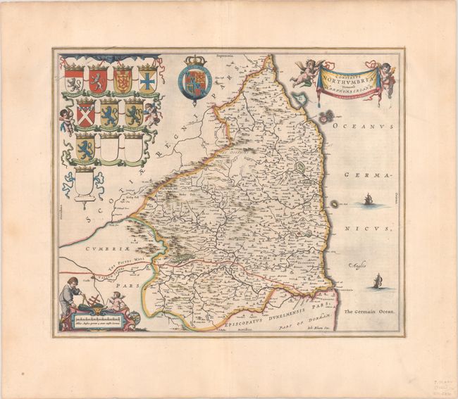 This decorative map of Northumberland extends from Newcastle upon Tyne to Carlisle in the south, and as far north as Berwick-upon-Tweed. Hadrian's Wall (here called the Pictes Wall) is prominently illustrated. The map is embellished with two sailing ships, putti holding aloft a banner with the title, a surveyor on the distance scale, and the coats of arms of important families in the region. Dutch text on verso, published between 1648-62.