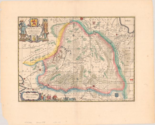 This exquisitely engraved map depicts the province of Drenthe in the northeastern part of the Netherlands. The map identifies the fortified cities of Coevorden, Meppel, and, just outside the province's boundaries, Steenwijk, Groningen, and Winschoten. There is excellent detail of the region's rivers, canals, roads, and topography, with pictorial representations of the forests and heathlands. Three coats of arms decorate the map. The ornate title cartouche features two hunters with their dogs and a slain boar between them, with the Leo Belgicus and Drenthe's coats of arms. Next to the distance scale cartouche is a scene of idling farmers and their sheep. Engraved by A. van den Broeck.