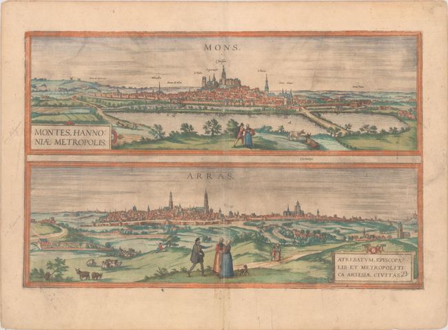 This sheet contains two separate panoramic views of Mons in Belgium and Arras in France. Nine locations are identified in the view of Mons, including the Grand Palace and the collegiate church of Sainte-Waudru. In the view of Arras, the Gothic town hall and its grandiose belfry reach high above the city. This is the second state. Latin text on verso, published in 1582 or 1588.