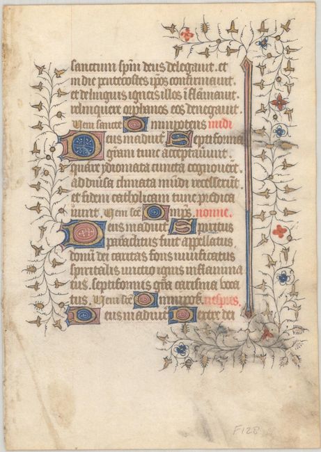 A nice vellum manuscript from a French Book of Hours, in the style of a Rouen scriptorium. Written in brown and red ink, the leaf has three large initials and numerous small initials in red, blue and burnished gold leaf, as well as a decorative panel in the margins with ivy and flowers. The text includes part of Psalm 84, and beginning with the large "C" on verso translates as: "Convert us, O God, our Savior, and turn your anger away from us."