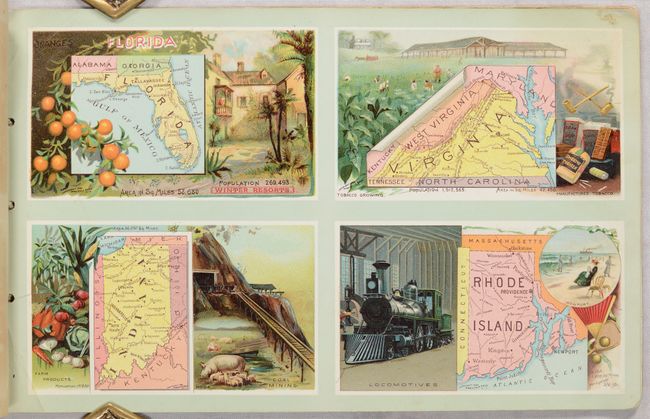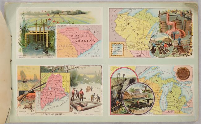 This unusual atlas was designed to advertise Arbuckle's Coffee. The atlas is printed on loose pages held together with original twisted string tie. This oblong 4to atlas has 12 sheets, each with four beautiful chromolithographic maps, plus the covers. The front pictorial cover features a fine bird's-eye view of the Capitol building in Washington with an eagle and small map of the District of Columbia on the U.S. shield. The back cover has a great map of Alaska surrounded by regional views of seals and whalers caught on an ice field by two polar bears, plus a moonlit view of the Arbuckle's Coffee factory in New York. Each of the 48 interior maps is surrounded by vignettes showing the beauty and commerce of the state, with text on the facing page describing the state or territory. Each of the 50 maps is beautifully lithographed in full color.