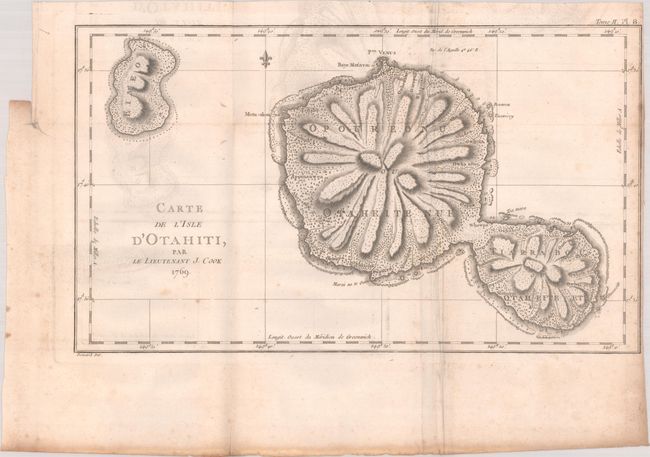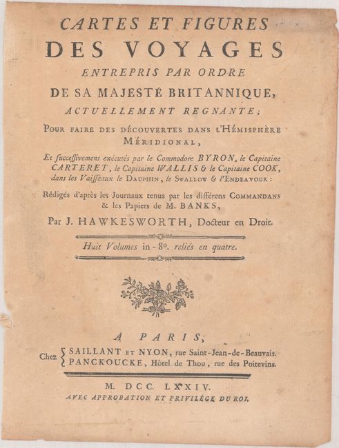 This disbound lot includes the title page and 33 (of 52) maps and plates from the atlas volume to a French edition of Hawkesworth's Voyages Around the World Undertaken by the Order of His Present Majesty... Hawkesworth's work was a compilation of the voyages of Commodore Byron, Captain Wallis, Captain Carteret, and Captain Cook. The English edition was first published in 1773, and was followed by editions in French and German. There are 13 maps in this lot, which were engraved by Bernard, and primarily feature islands in the South Pacific Ocean: