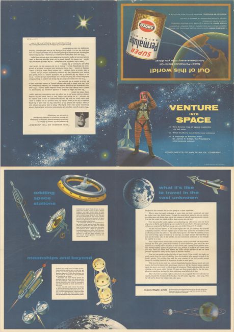 Published in the year following the launch of Sputnik, this Space Age map focuses on "a few long-standing puzzles of nature which may soon be cleared up by space explorers." Among the great mysteries this map takes as its subject are cosmic rays, gravity, interplanetary expeditions, and the expanding universe. It starts on the ground in the United States, showing scientific facilities like Cape Canaveral, the Naval Observatory in Washington, D.C., and the White Sands Proving Ground in New Mexico, expanding outward into the cosmos to depict satellites, rocket ships, Venus, Mars, sun spots, and the Andromeda Nebula. Text along the map's periphery and on verso further delves into scientific inquiries, and there is a message on verso from Dr. James R. Killian, Jr., President of MIT and Special Assistant to President Eisenhower for Science and Technology. Drawn by Rudy de Reyna for AMOCO (American Oil Company), with a can of their Super Permalube Motor Oil floating out into space. Self-folding into pictorial wrappers (9.0 x 6.5") featuring an astronaut.