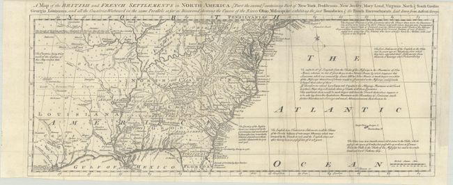 The second map is the southern sheet, which covers the region from Long Island through northern Florida, and extends well west of the Mississippi.  The map's unabashedly British perspective is reflected in a note at top left stating: "The Bounds of Virginia and New England by Charters May 28, 1609 and Nov. 3, 1620 extending from the Atlantic Ocean to the South Sea out of which our other Colonies were granted."  Lord Granville's Limits are also shown extending past the western edge of the map and the Bounds of Carolina stretch well into Florida.  This is the first time we have offered this fascinating pair of maps together.