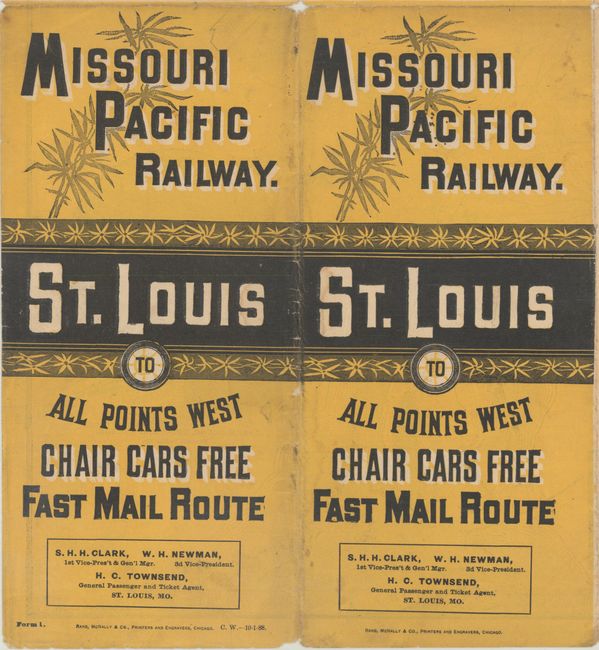 This folding map and timetable was published for the Missouri Pacific Railway, which included the lines of the Missouri, Kansas and Texas; St. Louis, Iron Mountains and Southern, International and Great Northern, Central Branch of the Union Pacific, and several more.  The major routes originate in St. Louis and travel westward though Missouri and Kansas and south into Indian Territory and Texas.  The map shows, in small line, all railroads in the United States as well as a few steamer routes.  With a nice agriculture-themed inset titled "Farm Scene, Southern Kansas" and another showing a "View at Galveston, Texas" with boats and a formation of ducks in the foreground.  Includes an extensive timetable on verso and self-folds into pictorial wrappers.  Printed by Rand McNally and dated October 1, 1888 on the rear wrapper.  A nice ephemeral piece that documents the continuing westward rush during the 19th century.