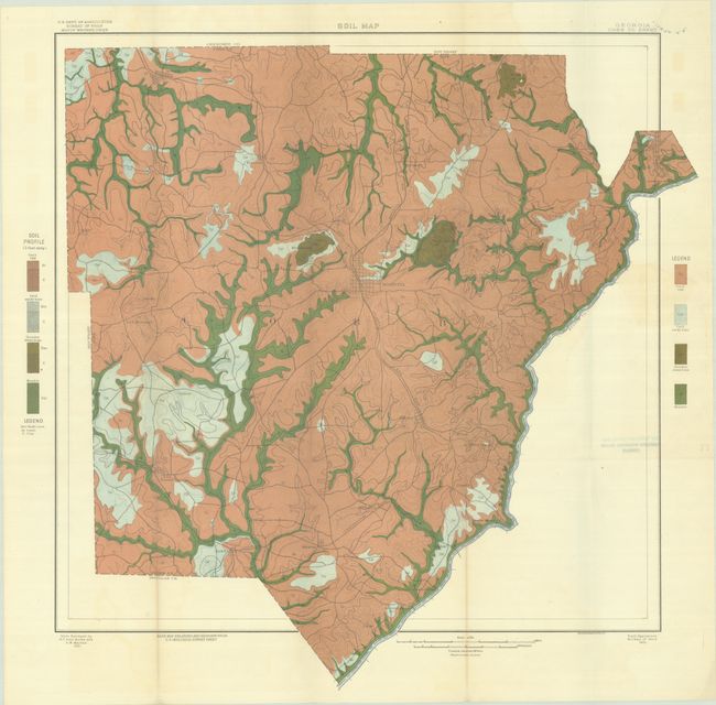 This lot is complete with 31 colorful and large soil maps from the 3rd Report of the Field Operations of the Bureau of Soils, published under the direction of Milton Whitney.  Of particular interest in this set are maps of Cobb County (near Atlanta), GA., Boise, ID., and Ventura, CA.  Each of the maps has a legend identifying the various soil profiles which are overlaid on base maps provided by the Geological Survey.  In addition to the soil types, the maps depict roads, railroads, cities and towns, county boundaries and topography via contour lines.  The full list of maps include: